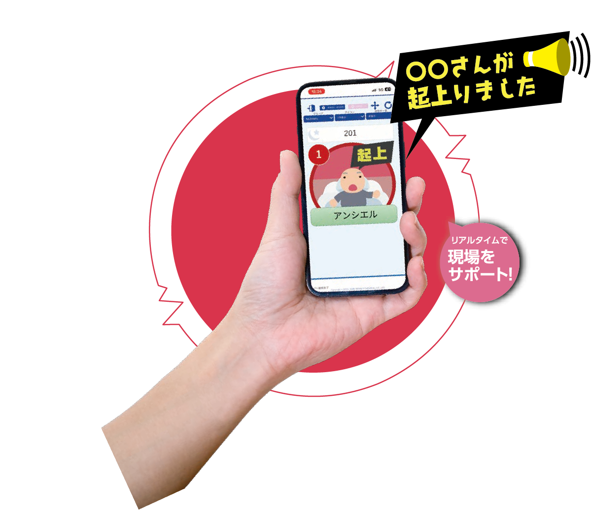 起上がり後、5秒程度※で端末にお報せが届きます。通知条件は現場に応じて設定(カスタマイズ)できます。